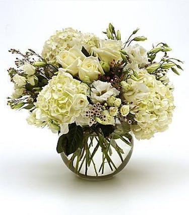 Beautiful fresh cut Hydrangeas,Roses and assorted accompanying foliage create the most elegant yet understated bouquet that will compliment the most discriminating taste