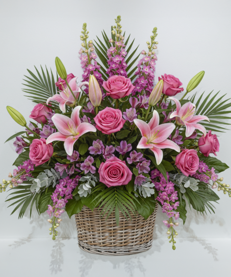 Crafted with a harmonious blend of delicate pink roses and stunning stargazer lilies, each bloom is carefully selected for its vibrant color and lasting freshness. Accented with lush green foliage, including broad palm leaves and soft eucalyptus, the spray features enchanting lavender delphinium and alstroemeria, adding depth and texture to this captivating display.