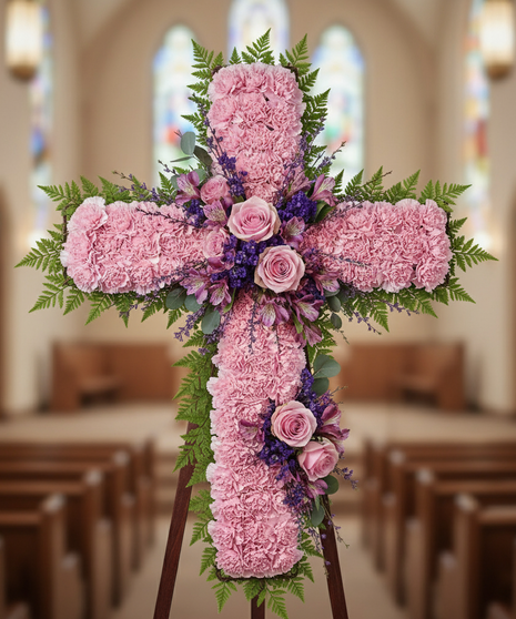 The Lavender Eventide Easel Cross: A profound and meaningful shape conveying faith and honor, displayed prominently on an easel.