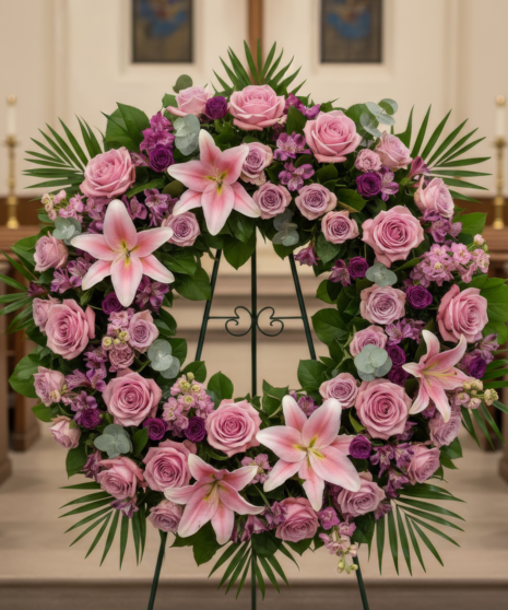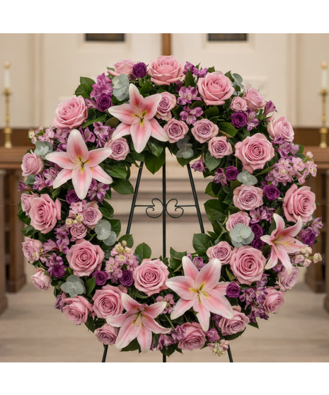 The Lavender Eventide Easel Wreath: A traditional, circular arrangement symbolizing eternal love and remembrance, presented on an easel.