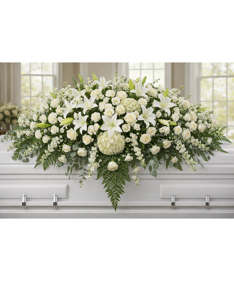 A serene tribute of grace and remembrance, this all-white casket spray offers a timeless expression of peace. Designed with lush white blooms and soft greenery, it evokes purity, reverence, and heartfelt farewell. Ideal for honoring a loved one with elegance and simplicity, this arrangement rests gently atop the casket, creating a soothing focal point during memorial services.