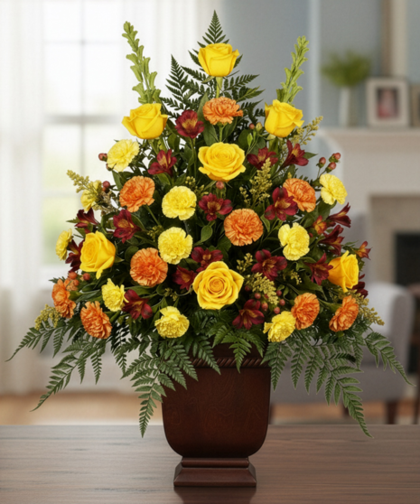 The Heritage Container Displays bring warmth and dignity to any remembrance with rich yellow roses, orange carnations, and deep red accents.