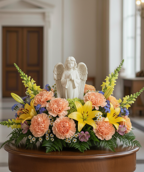 This centerpiece features a radiant mix of peach carnations, bright yellow lilies, cheerful snapdragons, and delicate filler flowers, all nestled in lush greenery. The warm, vibrant colors offer a message of hope and remembrance.