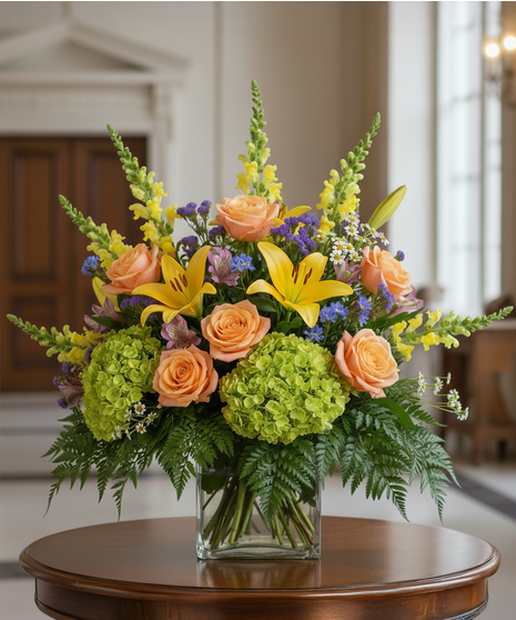 The arrangement features a captivating mix of flowers, each with its own special significance. The prominent peach roses symbolize sincerity, gratitude, and a gentle desire for long-lasting remembrance, while the sunny yellow lilies convey restored happiness and strength. Lush lime-green hydrangeas anchor the piece, representing heartfelt emotion and an apology for misunderstanding or deep gratitude. Tall, spiky snapdragons add a graceful height, symbolizing strength and graciousness. The entire display is artfully accented with delicate white daisies for innocence and new beginnings, and clusters of small blue and purple filler flowers that bring depth and a calming visual appeal.