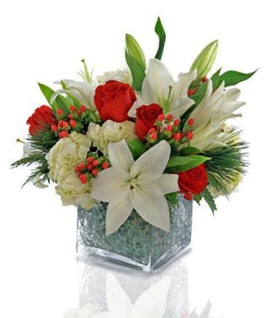 This beautiful cube vase is filled with lilies, red roses and more. It's simply perfect for almost any setting.