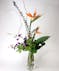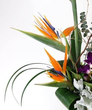 A beautiful vertical piece that will STUN. Tropical and vibrant, this is an arrangement that is sure to make a statement, with Birds of Paradise, Orchids, Eucalyptus and Aspidistra!